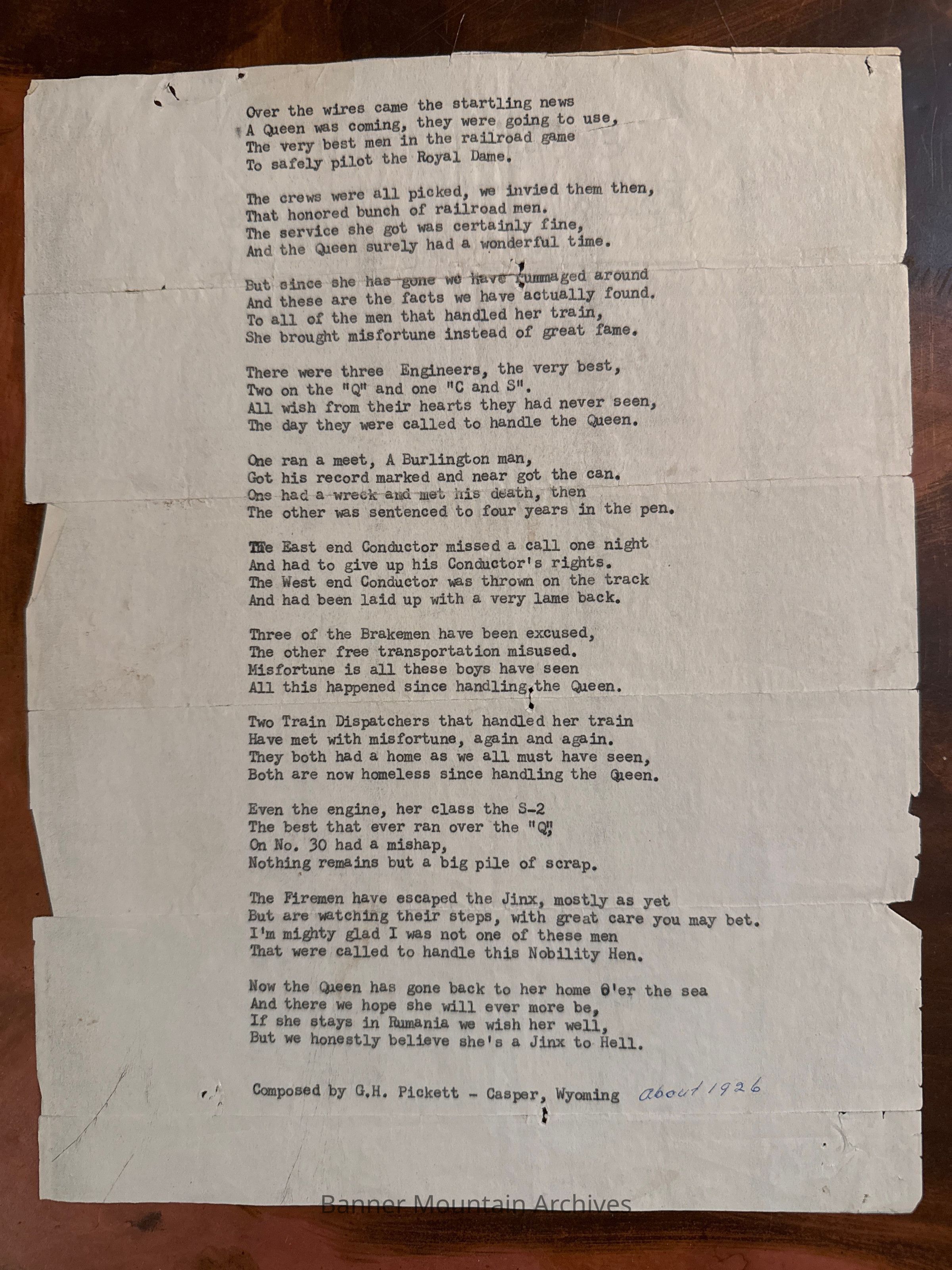 Poem about the special train from the Queen of Romania operated between Billings and Wendover and the misfortunes of the crew involved, composed around 1926.
