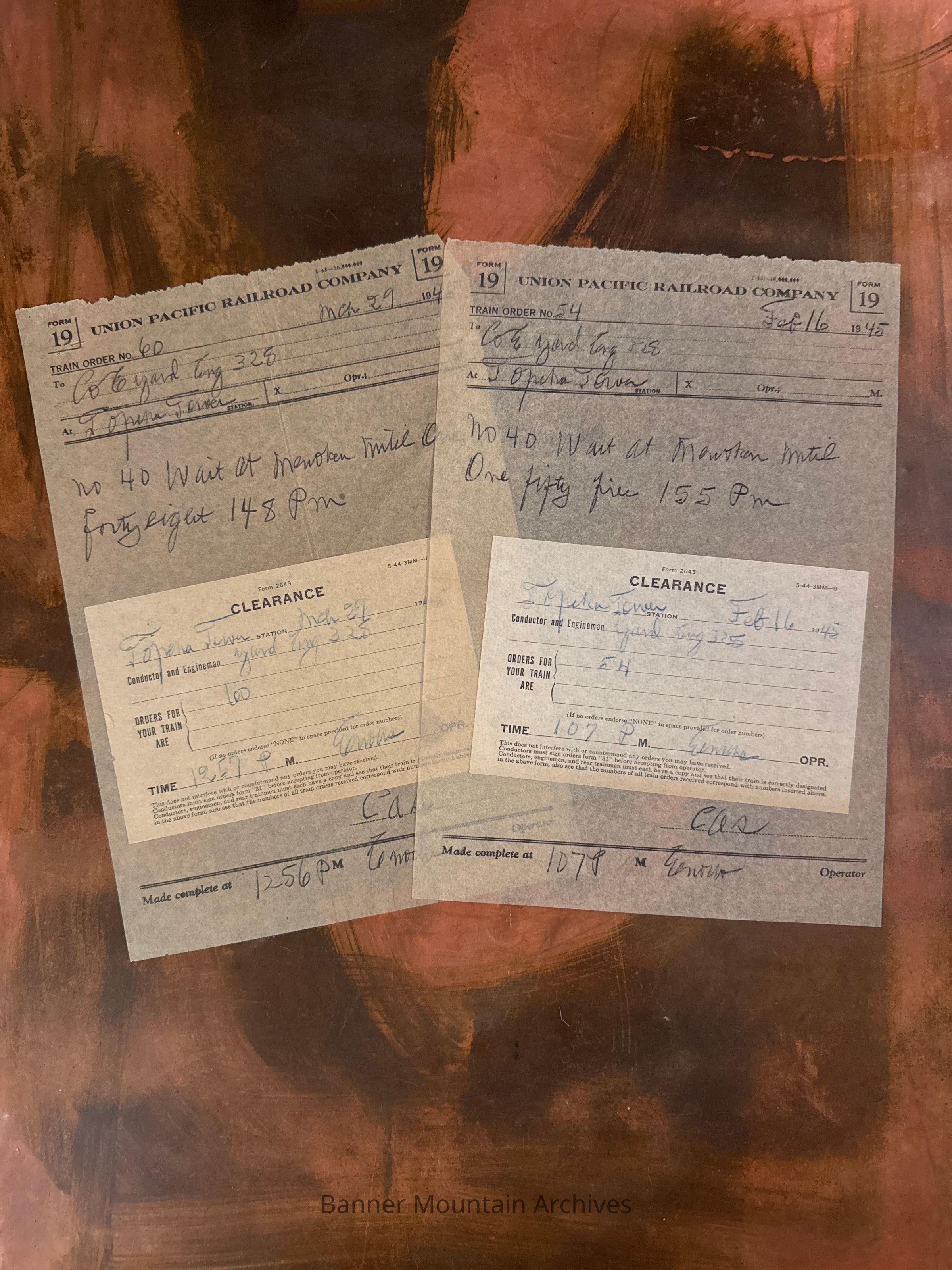 UP train order no. 238 to yard engine #272, “No. 43 run 1 hour and 50 min late Terminal Junction to Topeka. At 12:05 pm all over due first class trains except no. 43 have passed Terminal Junction,” with clearance card, Topeka Tower, January 10, 1945.Creator