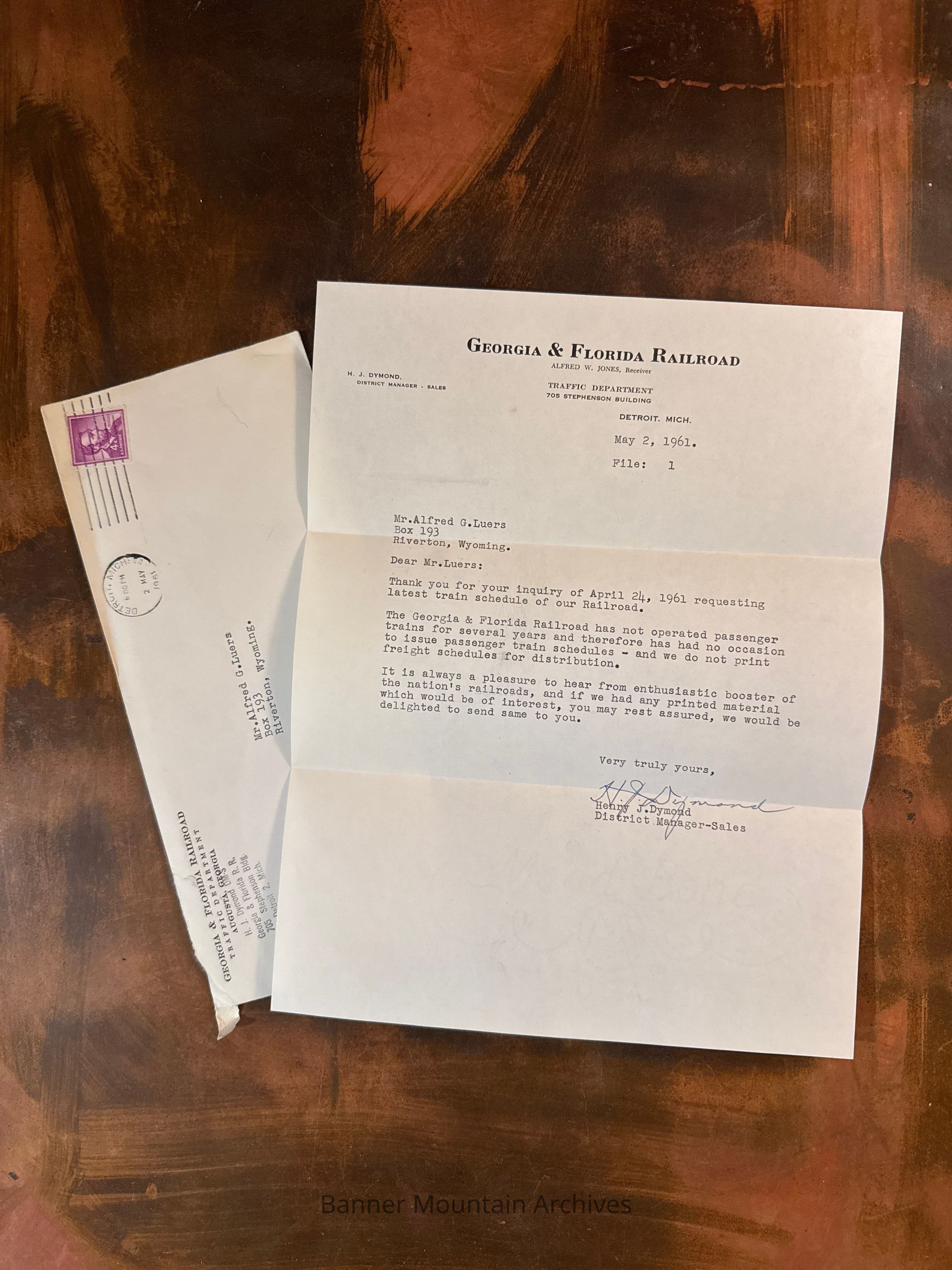 Envelope from the Georgia & Florida Railroad sent to Alfred Luers of Riverton, WY, May 2, 1960.Creator