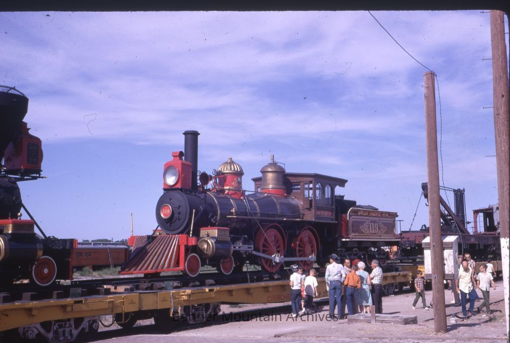 Union Pacific Railroad Golden Spike Exposition train in the CB&Q yard in Casper, reproduction of Central Pacific's #60 "Jupiter" and UP #119 on flatcars, crane car to the right, children on the ground ringing the locomotive bell with a rope, August 7, 1969