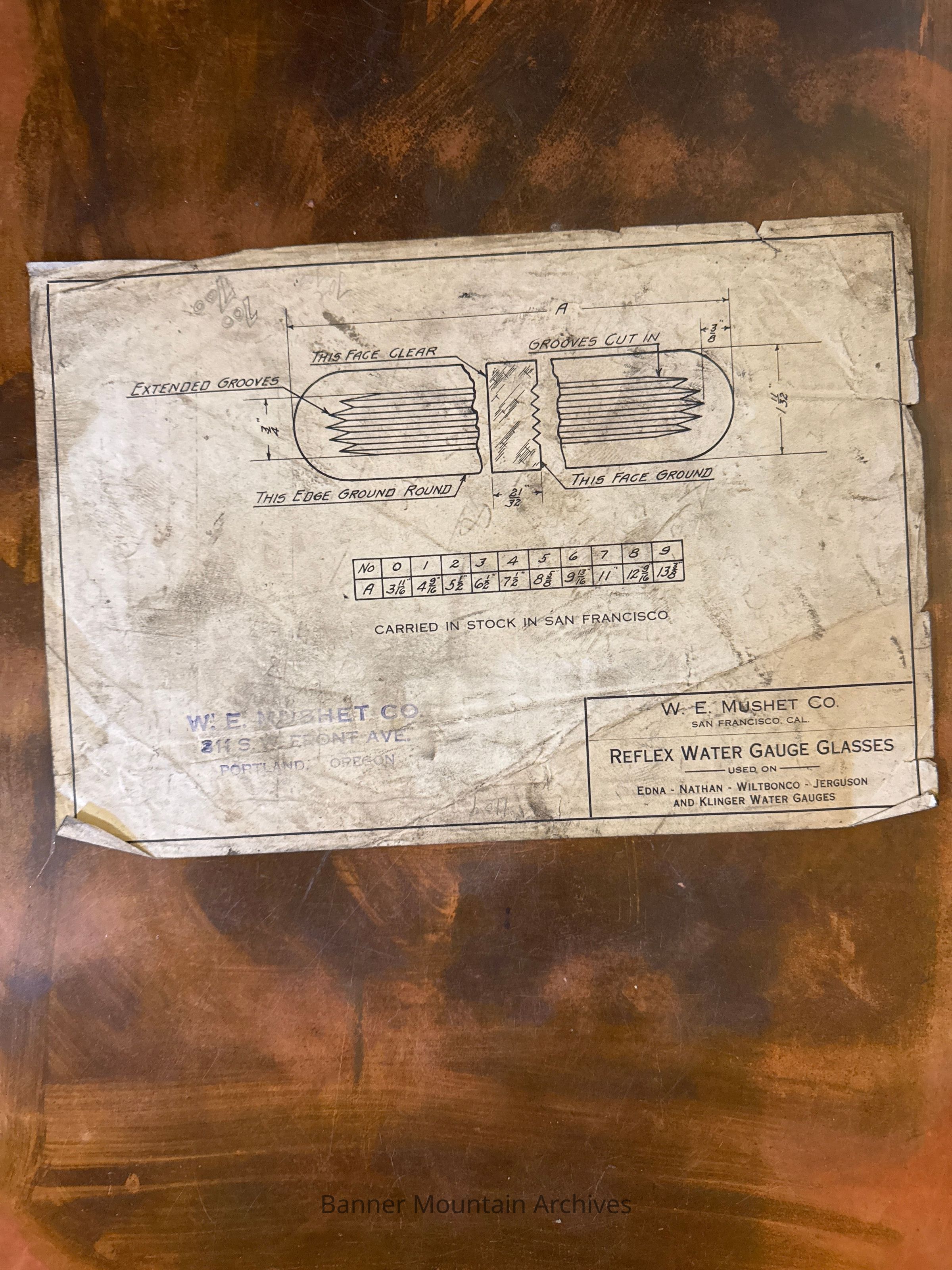 Plans for reflex water gauge glasses used on Edna, Nathan, Wiltbonco, Jerguson and Klinger water gauges from the W.E. Mushet Co. used by the Craig Mountain Railway Co.