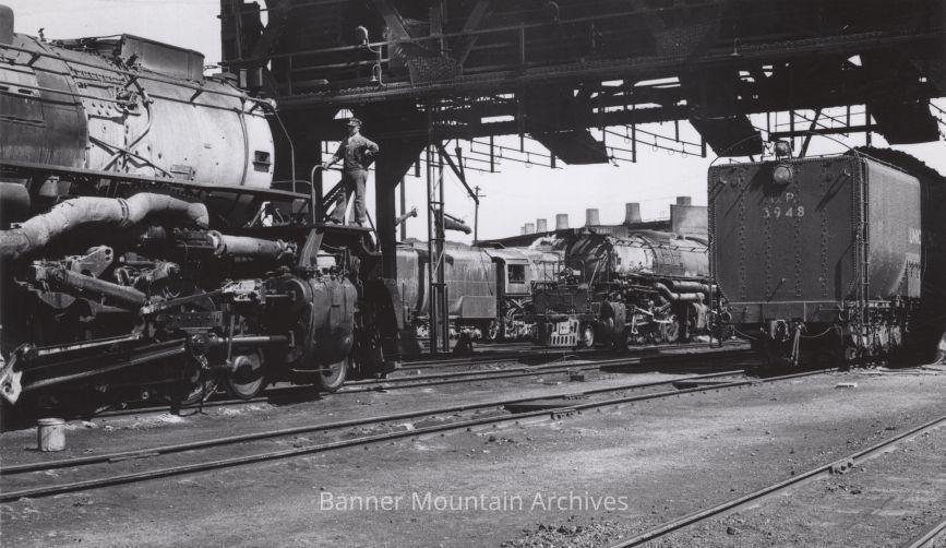 UP coal dock in Cheyenne, crew member on front of locomotive, roundhouse in background, Cheyenne, WY, September 20, 1956.