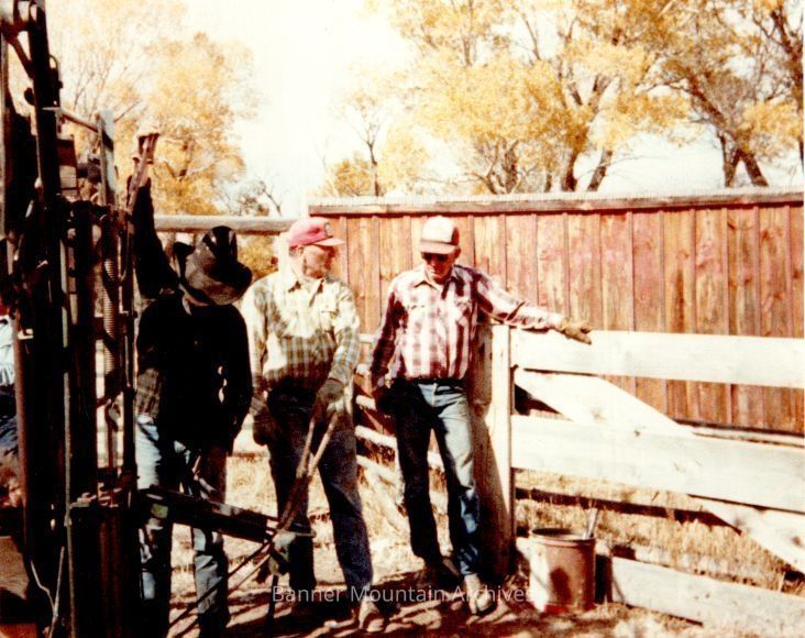 Dehorning at the Tobin place, left to right, Leonard Carter, Stan Stewart, Bryant "Cactus" McCleary, Banner Ranch, circa 1980s.Photograph Details