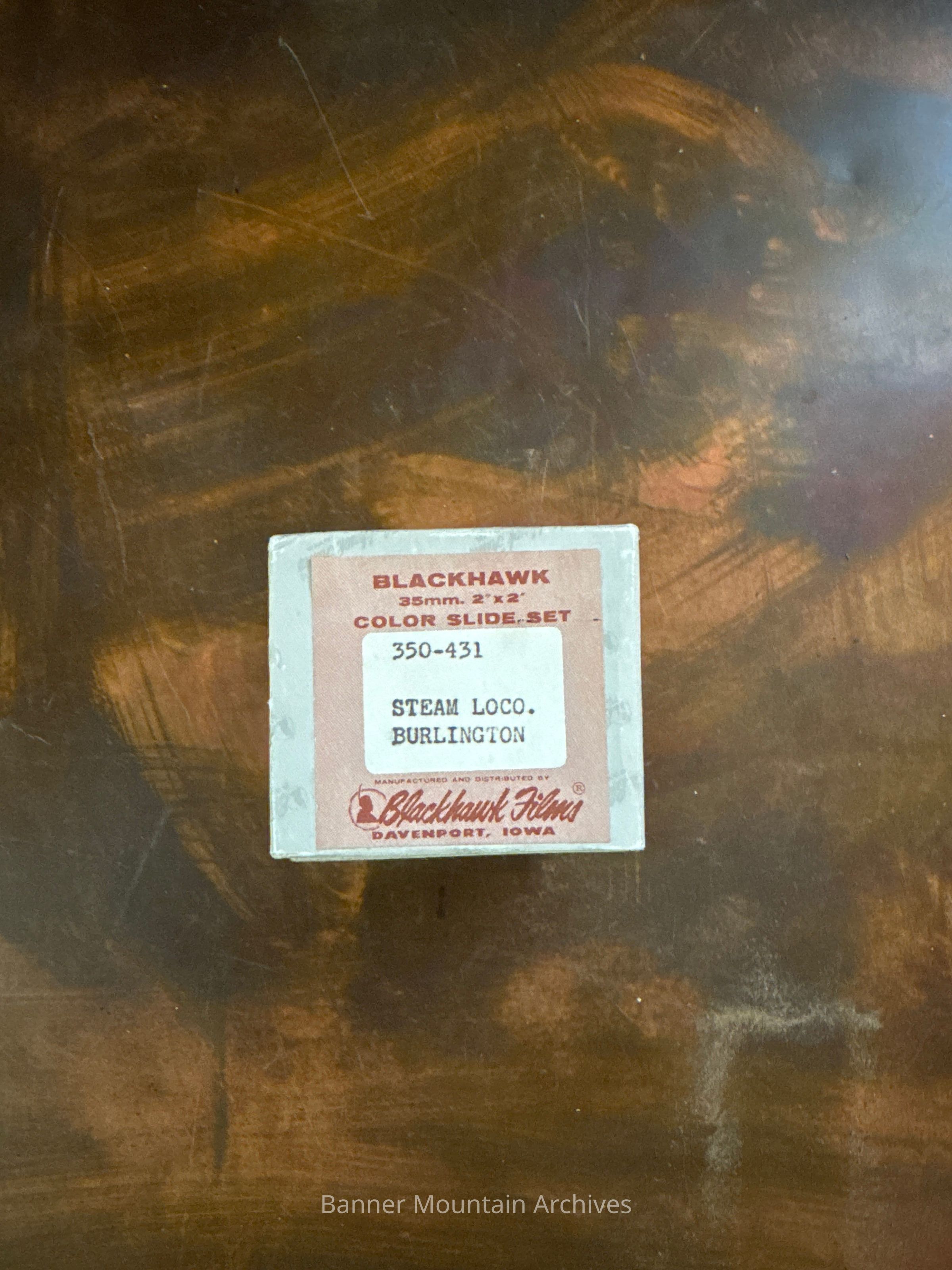 35mm 2" x 2" color slide set from Blackhawk Films, no. 350-431, "Steam Locomotives Burlington." Set of 30 slides in original box.Category