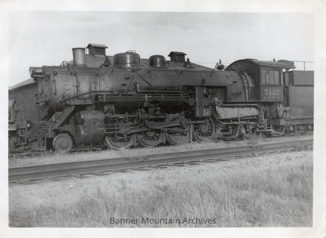 Chicago, Burlington and Qunicy steam locomotive #5127, the last steam locomotive in service on the Casper Division which departed from Casper December 16, 1953 on a work extra east with Engineer Mike Ludwig and Fireman Earl Marsh, seen in Douglas.Photograph Details