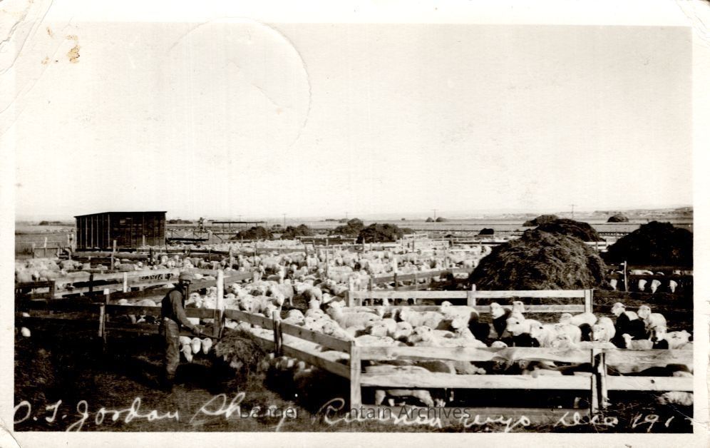 Postcard image of O.J. Jordan sheep in corrals, Riverton, WY, 1913.Subject Person/Organization