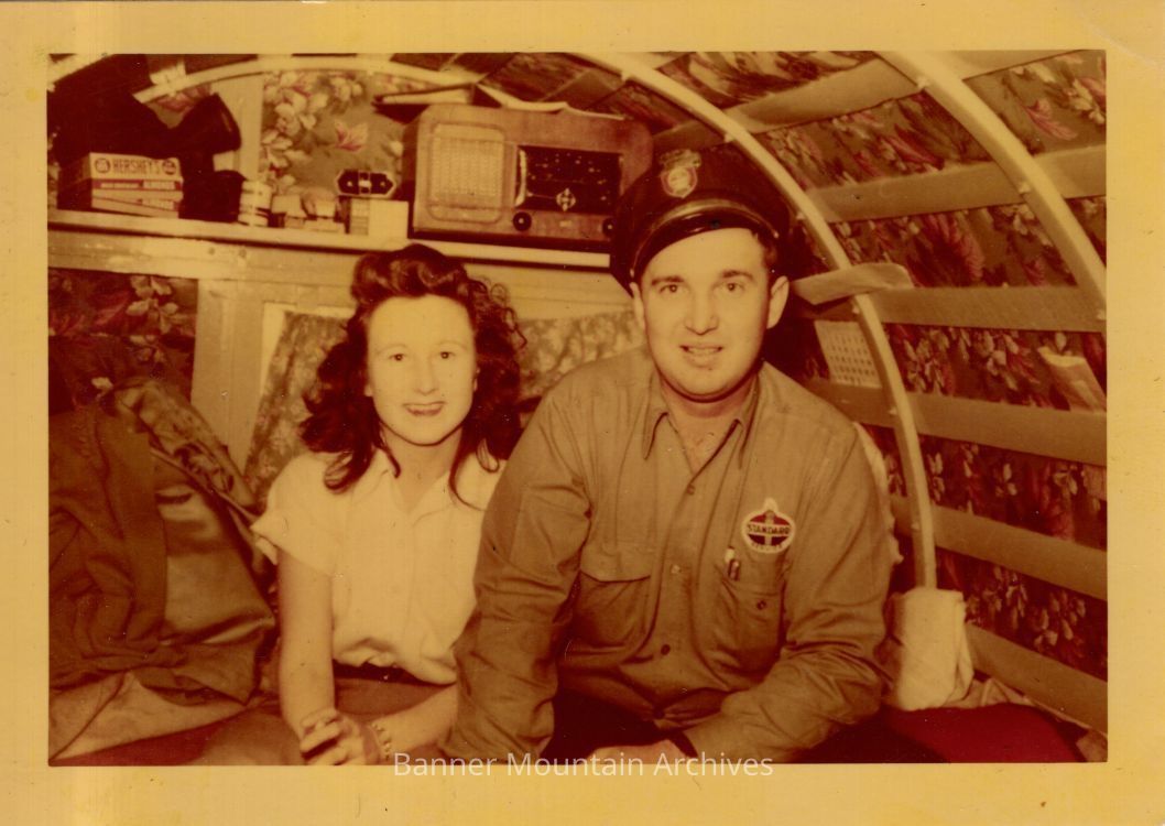 Couple in a sheepwagon, man in a Standard Oil uniform, circa 1951.Photograph Details