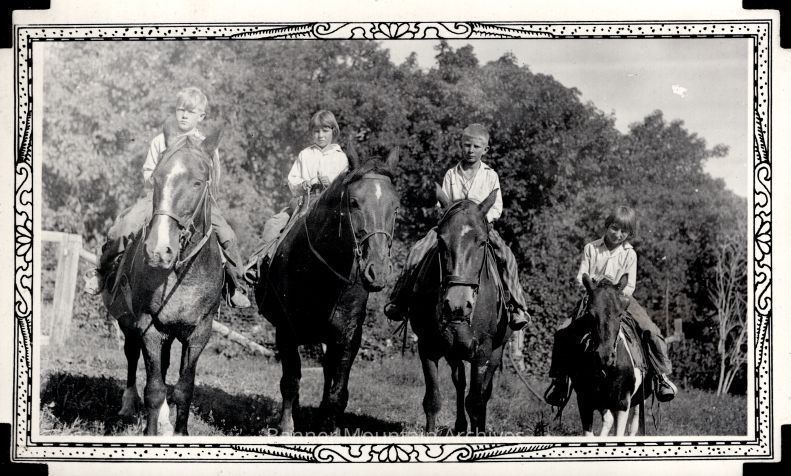 Henry, Lorena, Bryant "Cactus" and Marian McCleary on horses, early 1930s.Photograph Details
