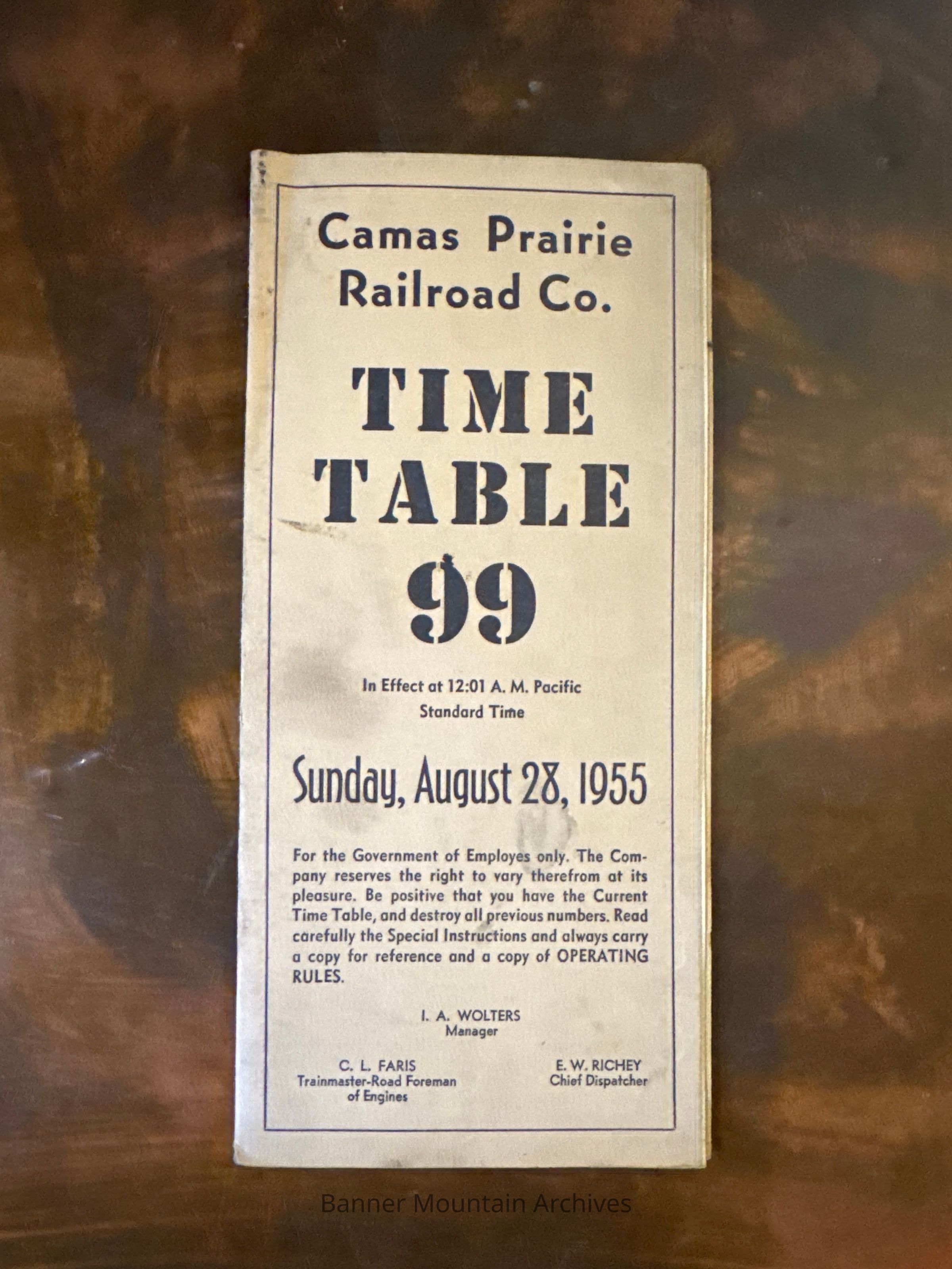 Camas Prairie Railroad Co. timetable no. 99 issued August 28, 1955. Two copies.