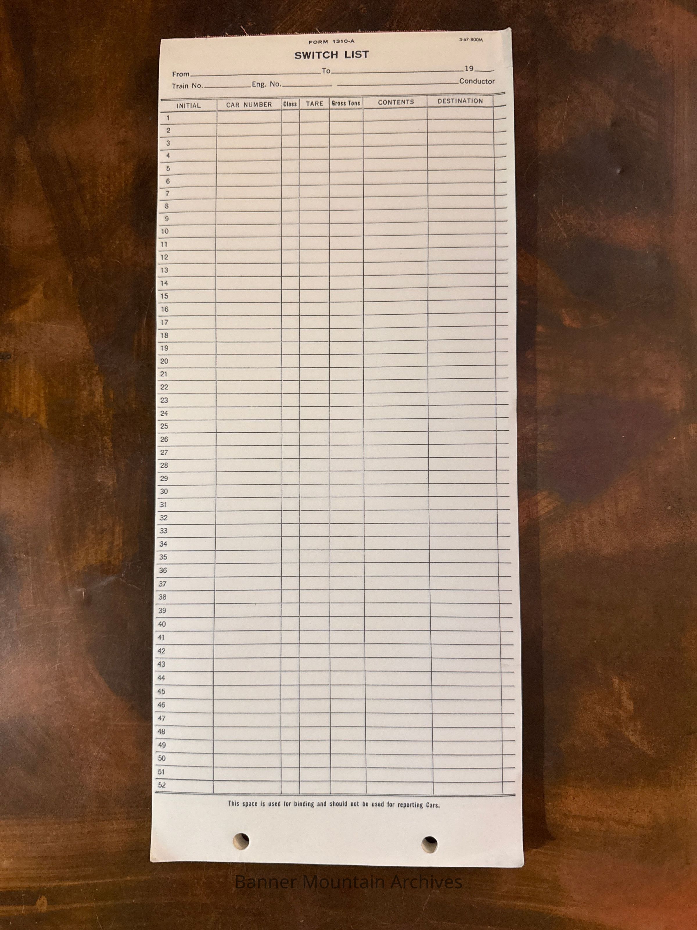Pad of switch list forms, form 1310-A, unused, 1967.
