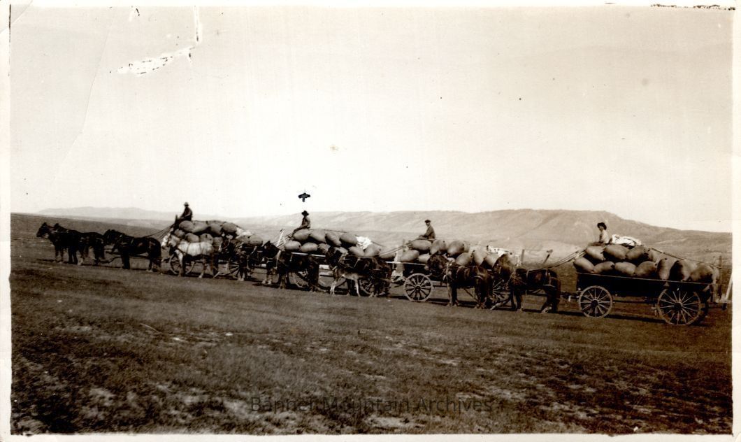 Hauling wool sacks on horse drawn wagons along present day Hat Six Road, circa 1920s.Photograph Details