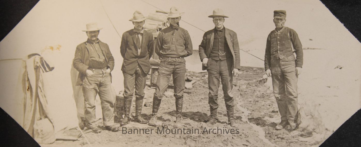 Chicago and North Western survey crew at Wolton, WY, left to right Ed Coam, H.B. Dagget, S.O. Kretsinger, Ed. Hawley and Lee Anderson, February 1906.Photograph Details