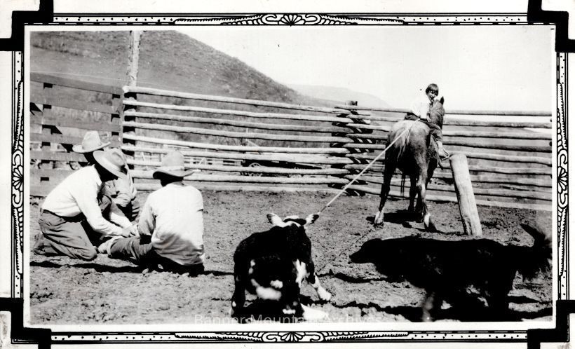 Marion "Mick" McCleary roping a calf at a branding, circa early 1930s.Photograph Details