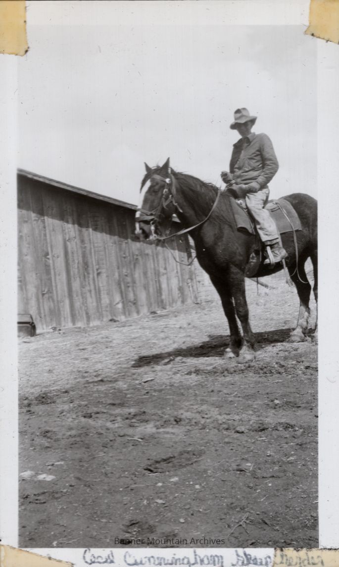 Cecil Cunningham, sheepherder, on a horse, circa 1940s.Photograph Details