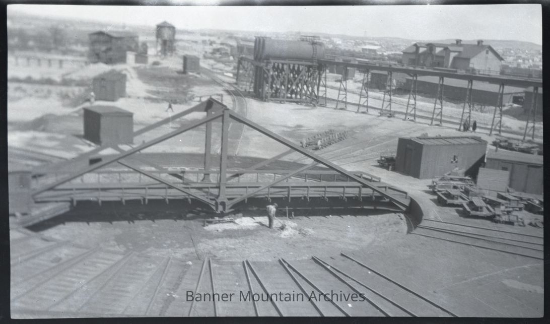 CB&Q turntable and servicing structures in Casper, man in turntable pit with shovel, circa 1920s.