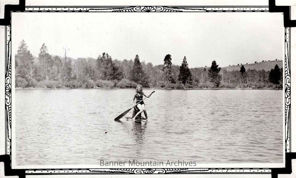 Betsy Nichols Bowen bringing in a raft on Half Moon Lake, circa early 1930s.Photograph Details