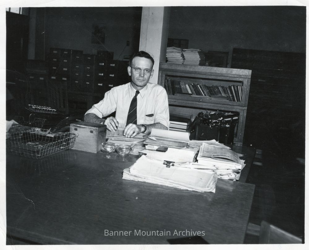 Tom Cole, clerk in the Master Mechanic's office of the Chicago, Burlington & Quincy roundhouse in Casper, at his desk, circa 1940s.