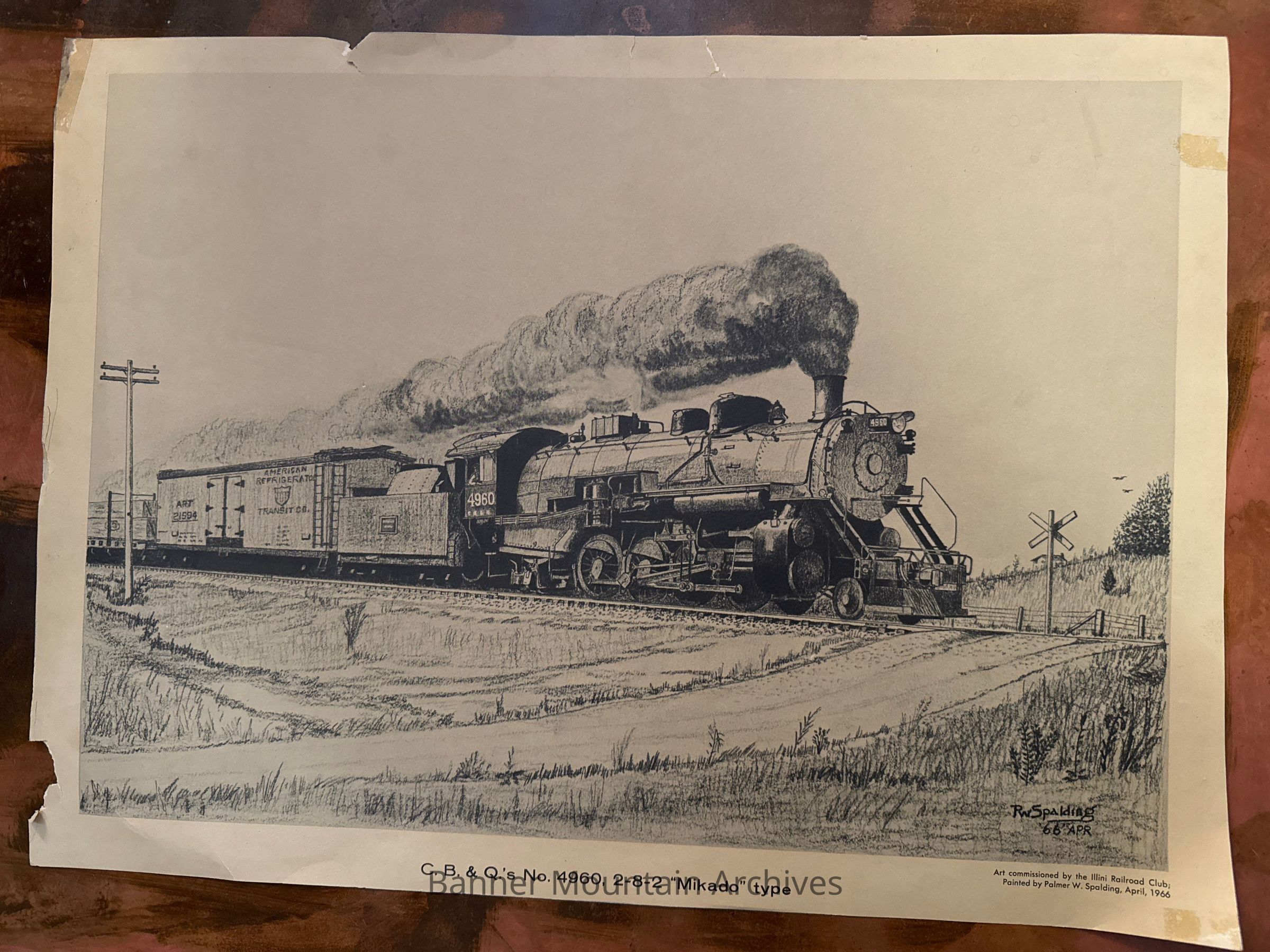 Print of a painting of CB&Q 2-8-2 “Mikado” type steam locomotive #4960 commissioned by the Illini Railroad Club, April 1966.