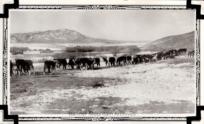 Cows on the feedline on the Jack Hammer meadows, circa 1930s.