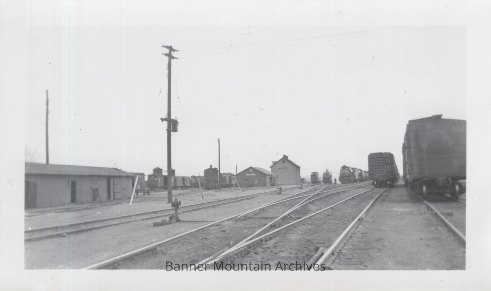 Chicago, Burlington and Quincy Casper yard with rolling stock and approaching freight train, circa 1940.