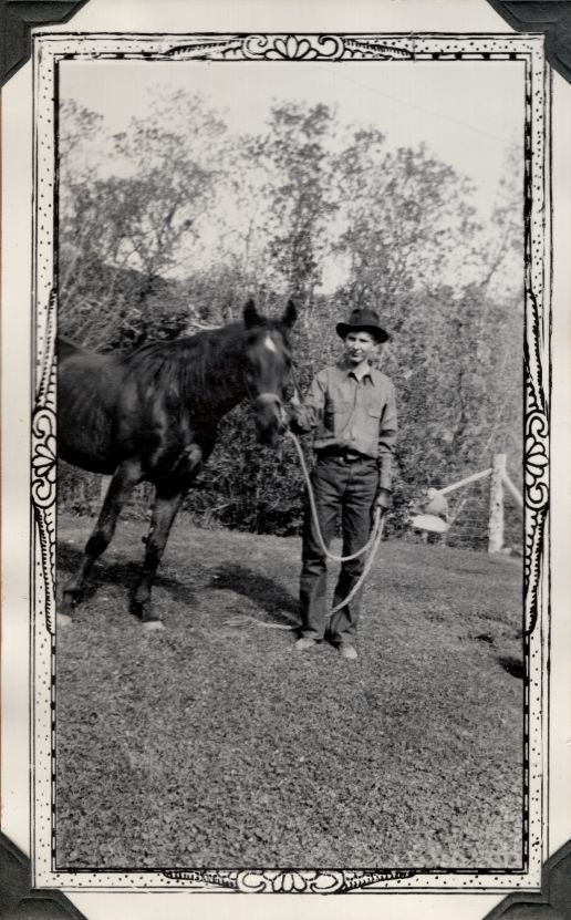 Bryant "Cactus" McCleary with a horse at the Banner Ranch, circa mid-1930s.Photograph Details