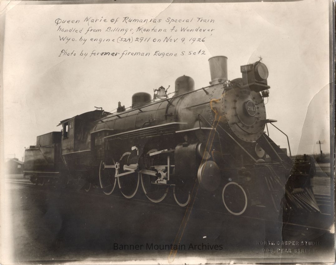 Chicago, Burlington and Qunicy steam locomotive S2A #2911 which handled Queen Marie of Romania's Special Train handled from Billings, MT to Wendover, WY, seen in Casper, November 9, 1926.Photograph Details