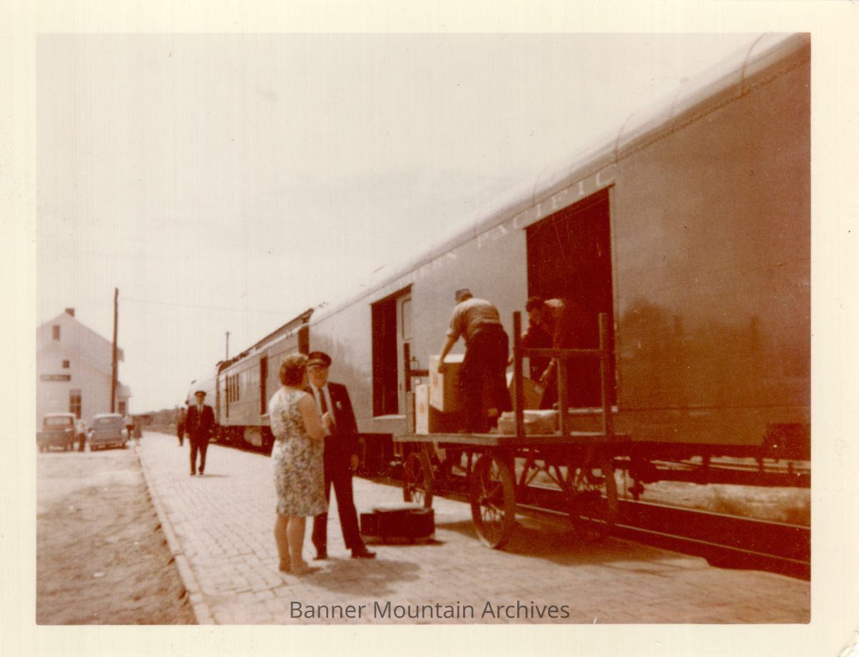 Loading the Northern Pacific baggage car on the last passenger train to leave Casper, CB&Q's train no. 29, Greybull, WY, September 2, 1967.