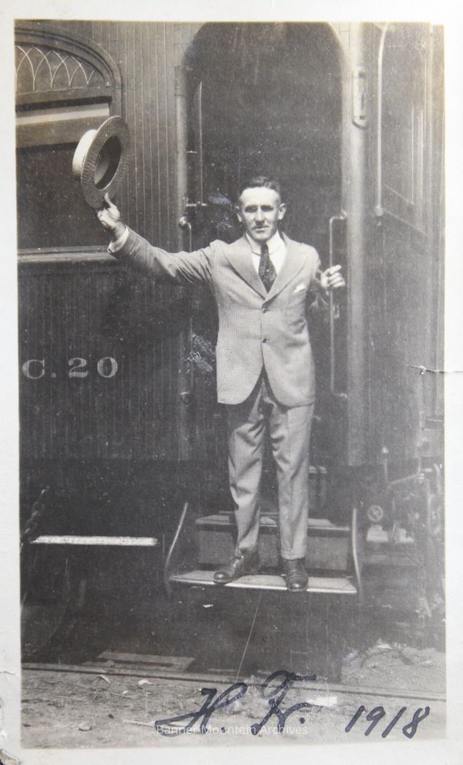 Unknown men on the steps of a passenger car, "H.H.," 1918.Photograph Details