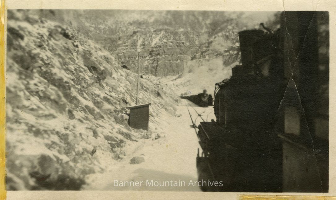 Chicago, Burlington & Quincy Railroad trains passing in the Wind River Canyon, view from the fireman's side of the cab, 1940.
