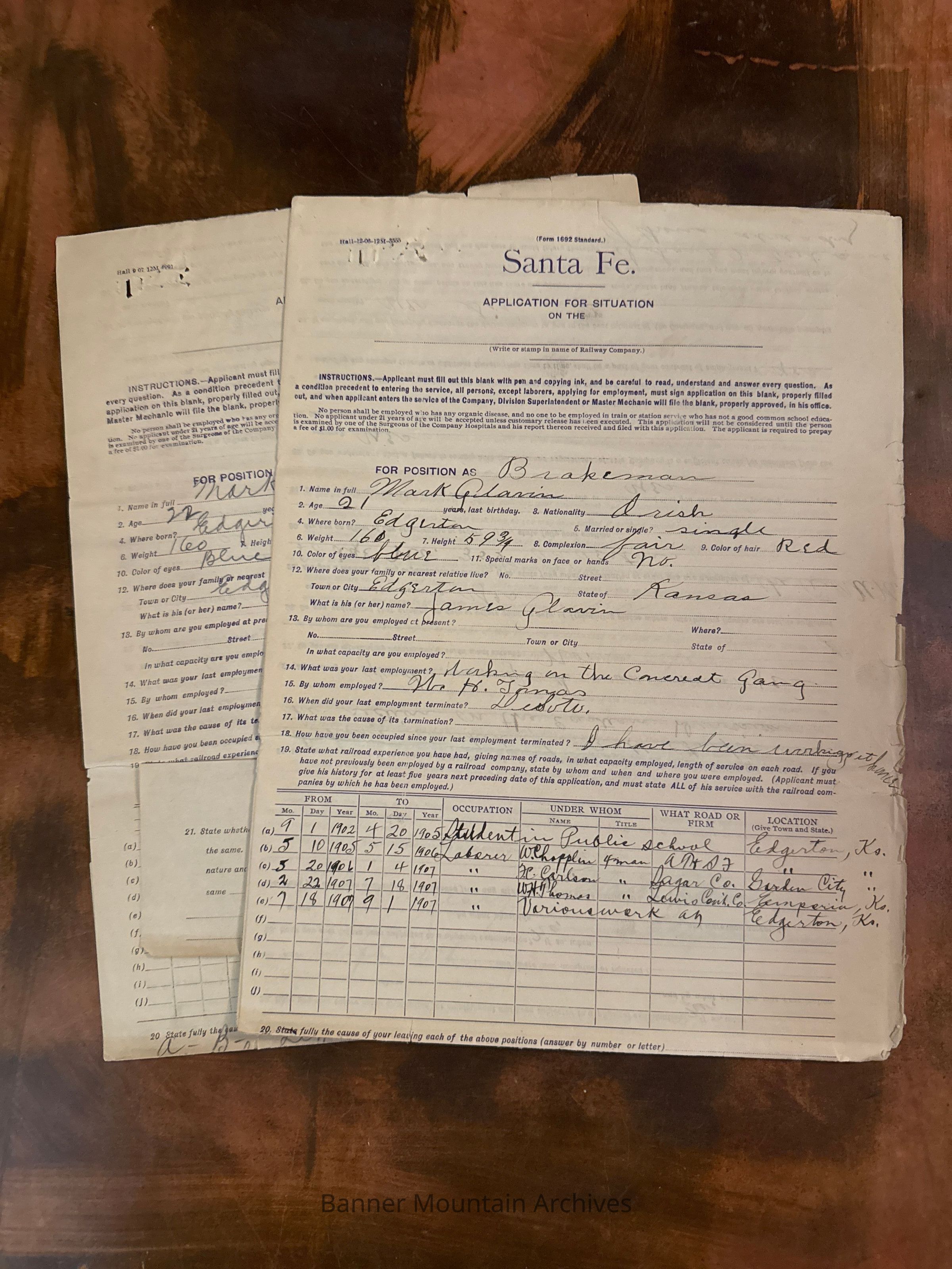 Job application to the AT&SF for a position as brakeman by Mark Glavin of Edgerton, Kansas, September 20, 1907.Creator