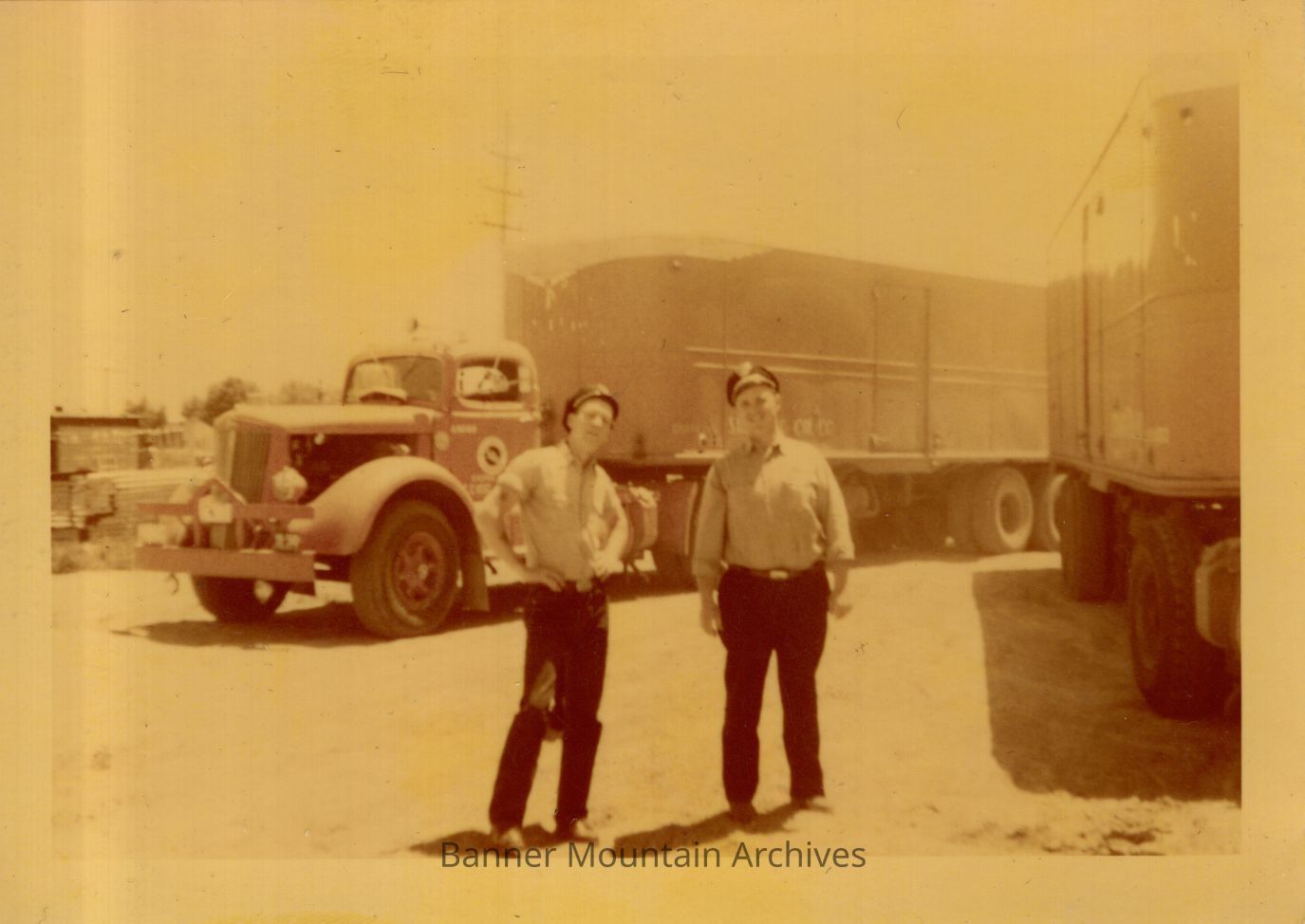 Smeal Trucking drivers with their trucks, unknown man to left with Ray Smeal, circa 1950s.