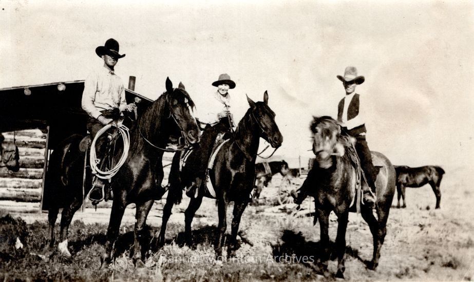 Riders outside a cabin, Lena Brooks in the center, circa 1910s.