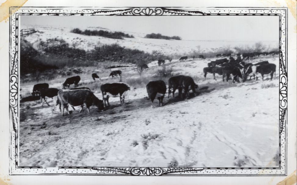 Banner Ranch Hereford cows on the feedline, circa 1930s.
