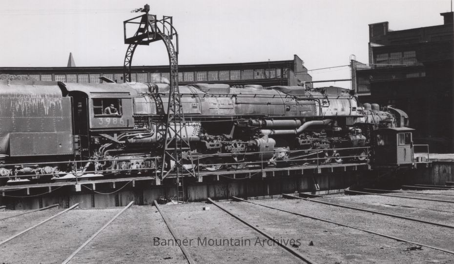 UP Challenger #3986 on the Cheyenne turntable, engineer visible in cab window, turntable operator visible in shack, September 20, 1956.