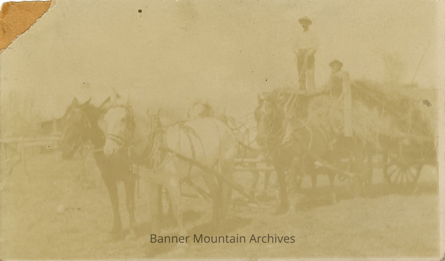 Horse-drawn hay wagon, Ed Cole on the wagon, unknown location and date.