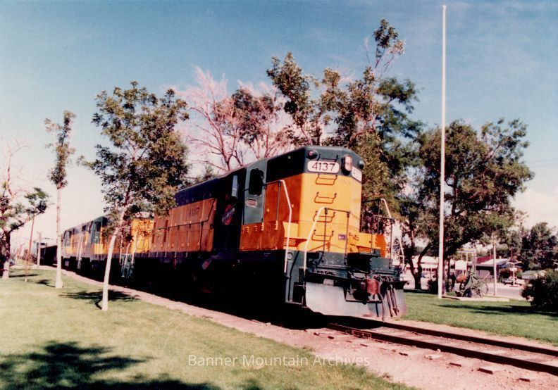 Chicago & North Western freight train led by diesel #4137 passing through Veteran's Park, Casper, circa late 1980s.