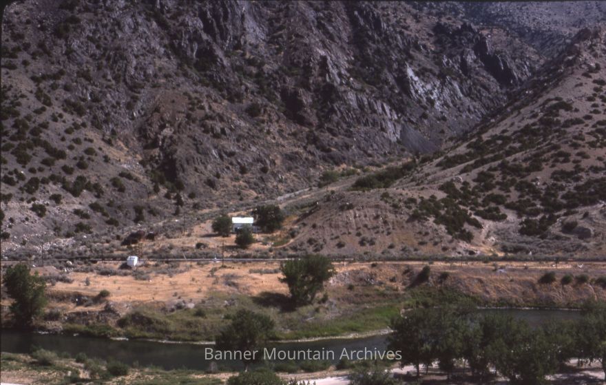 Chicago, Burlington and Quincy Railroad section house in Wind River Canyon viewed across Boysen State Park and the Wind River near the south entrance of the canyon, August 22, 1977.Photograph Details