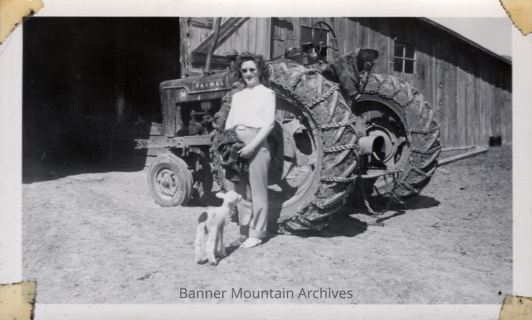 Woman and a lamb next to the Farmall M parked outside the lambing shed, circa 1940.