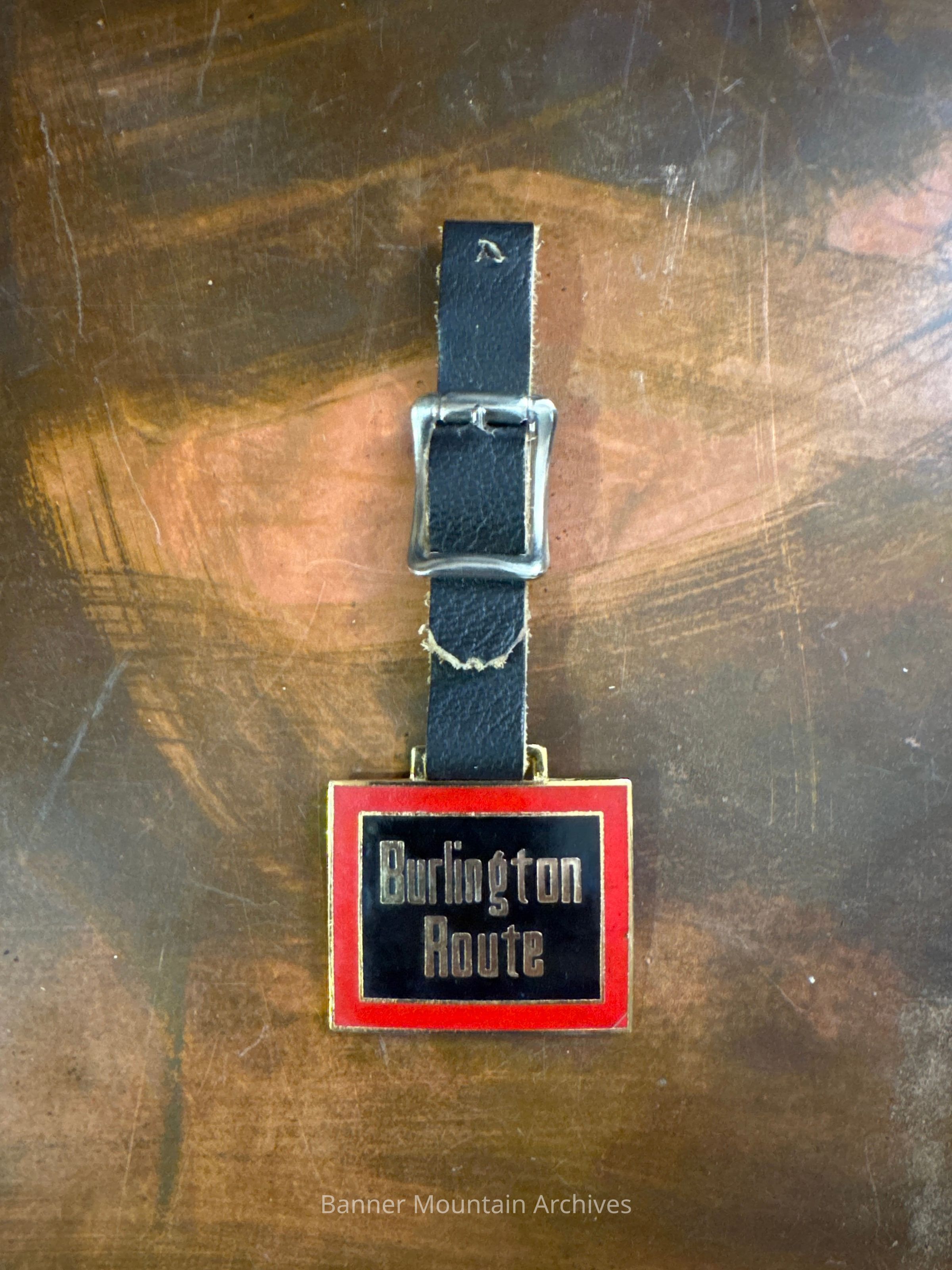 Chicago, Burlington and Quincy Railroad watch fob with leather strap, carried by Tom Cole.