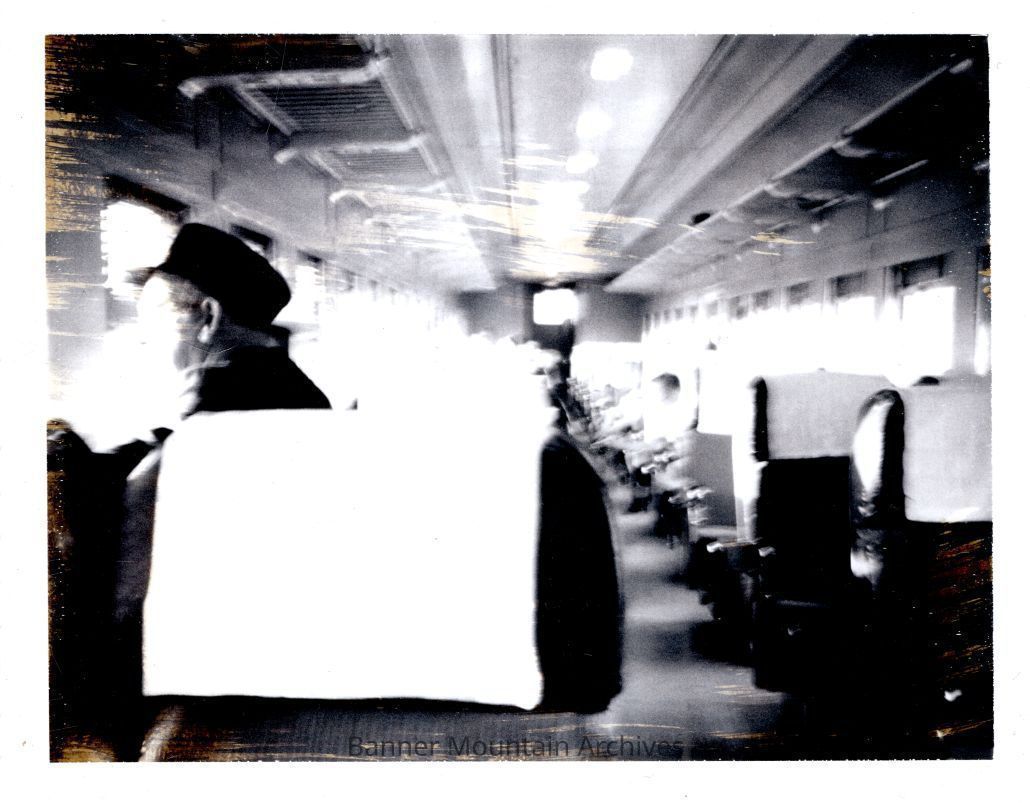 Interior of Chicago, Burlington and Quincy Railroad coach #4520 on train number 30, August 11, 1967. Conductor Arneson to the left.