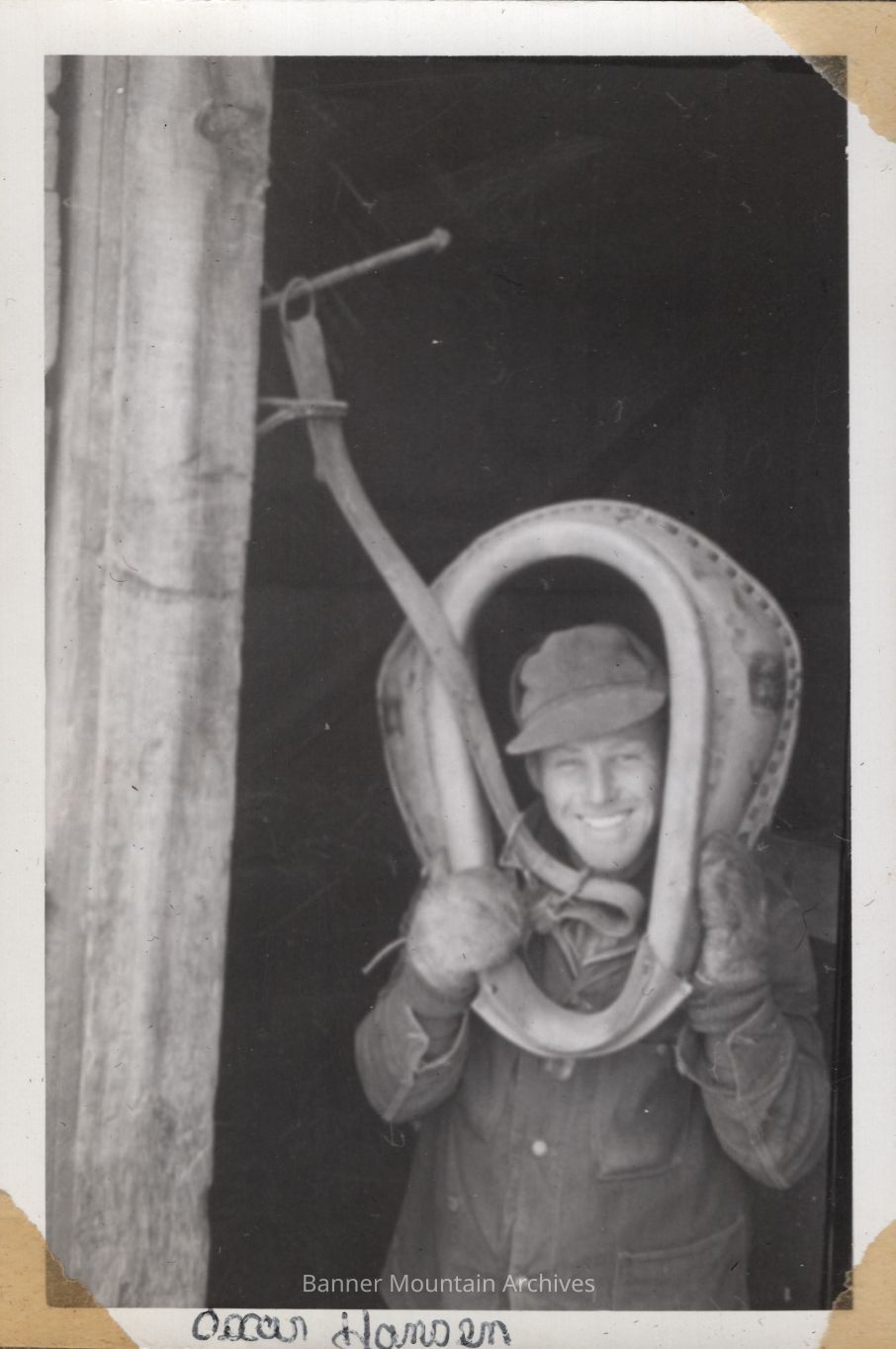 Oscar Hansen with a horse collar in a barn, circa 1940s.
