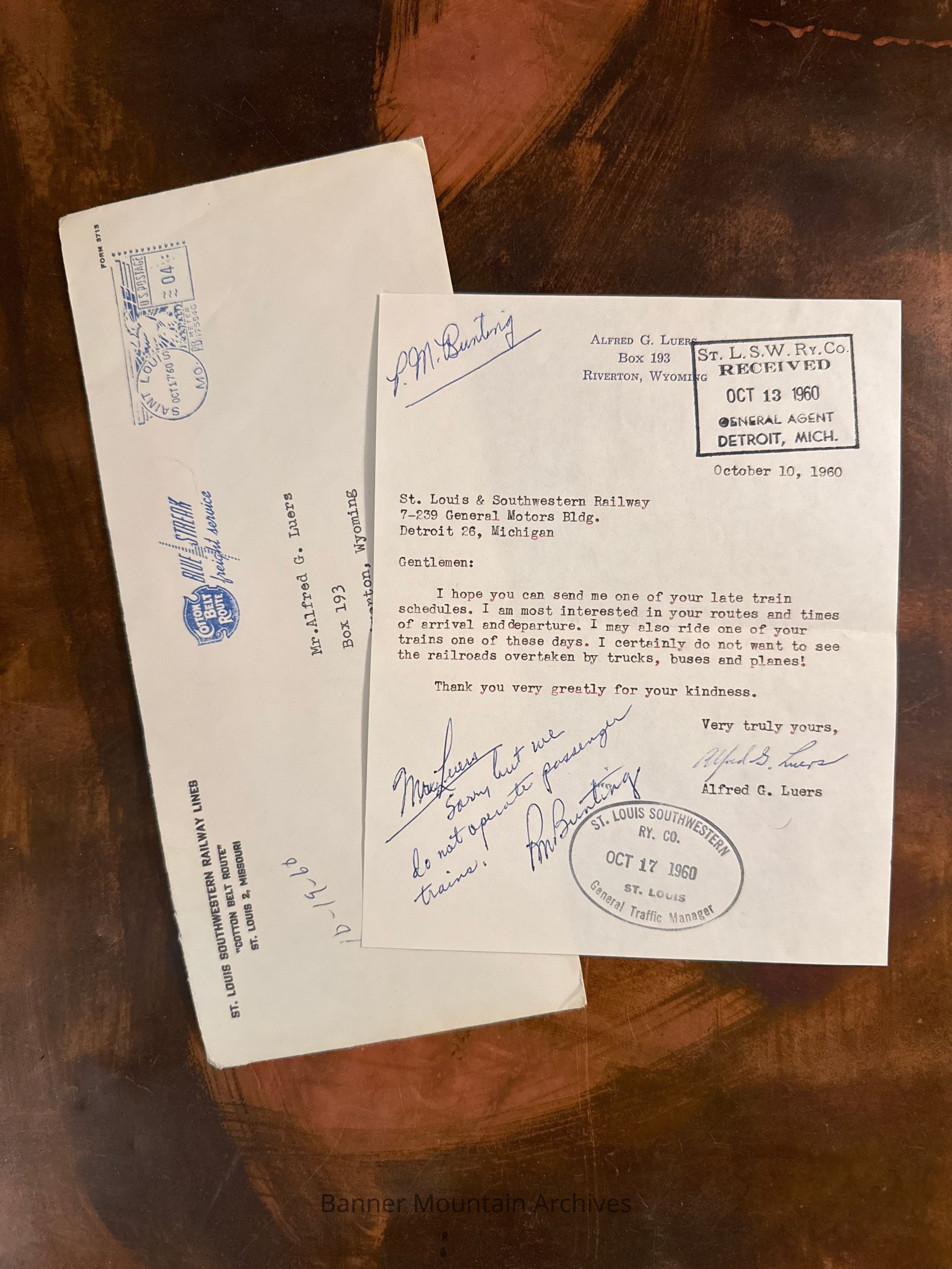 Letter to the Cotton Belt Route from Alfred Luers requesting information on passenger trains with handwritten reply, October 10, 1960.Creator