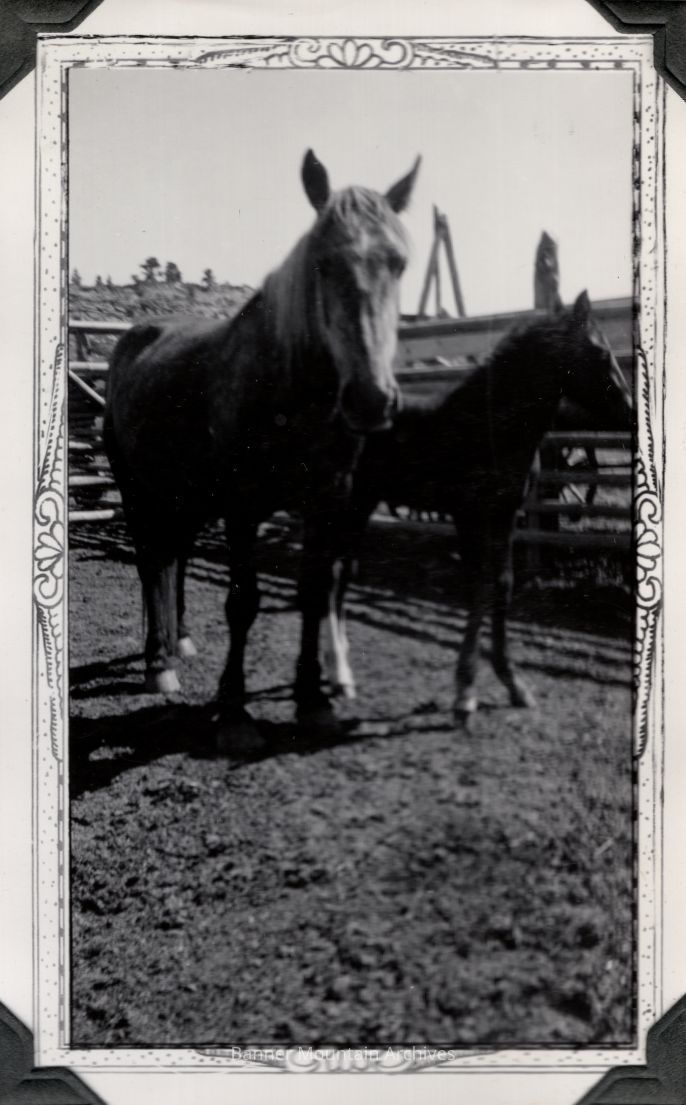 Banner Ranch horses in a corral, circa 1930s.
