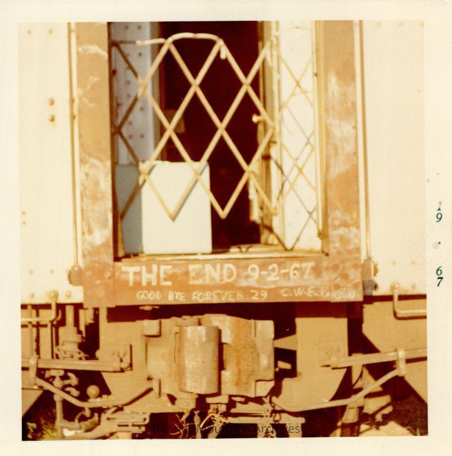 Message from Chuck Eckerson on the diaphragm plate of the last passenger train to leave Casper, CB&Q's train no. 29, September 2, 1967.Photograph Details