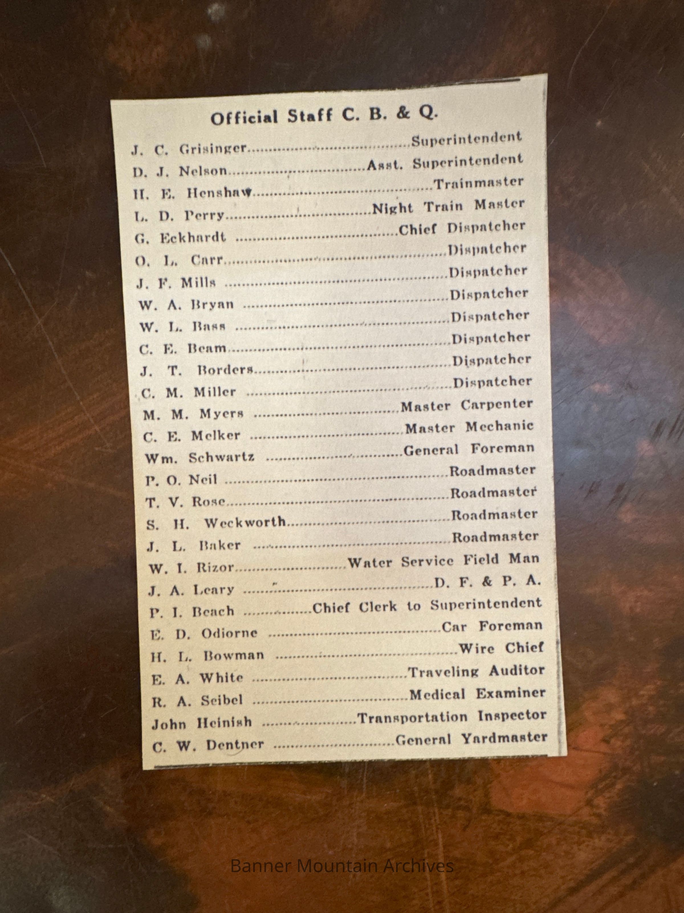 Chicago, Burlington and Quincy Railroad, John Cloyd Grisinger, D.J. Nelson, H.E. Henshaw, L.D. Perry, G. Eckhardt, O.L. Carr, J.F. Mills, W.A. Bryan, W.L. Bass, C.E. Beam, J.T. Borders, C.M. Miller, M.M. Myers, C.E. Melker, William Schwartz, P.O. Neil, T.V. Rose, S.H. Weckworth, J.L. Baker, W.I. Rizor, Jack Leary, P.I. Beach, E.D. Odiorne, H.L. Bowman, E.A. White, R.A. Siebel, John Heinish, C.W. Dentner