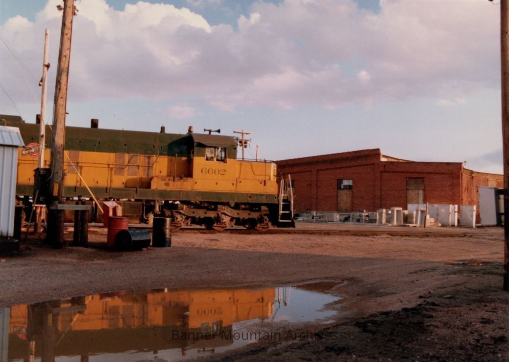 Chicago & North Western diesel locomotive #6602 at the Casper Roundhouse, circa late 1980s.