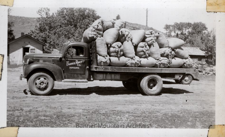 Ranch truck loaded with wool sacks, Banner Ranch, circa 1940s.
