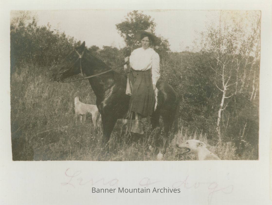 Lena Brooks on a horse with her hunting dogs, V-V Ranch, circa 1900.Photograph Details
