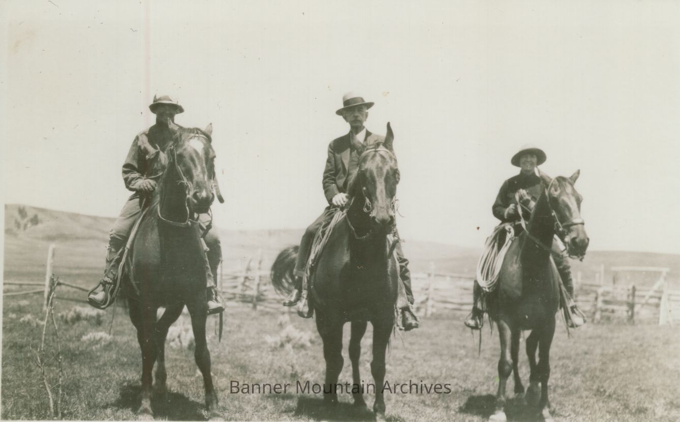 John Brooks, Center, with two of BB Brooks' daughters on horses, Natrona County, circa 1920s.Photograph Details