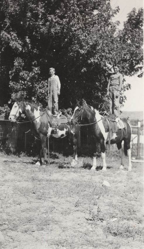 James "Jim" and Richard "Dick" Spurlock standing on their horses, circa 1930s.Photograph Details